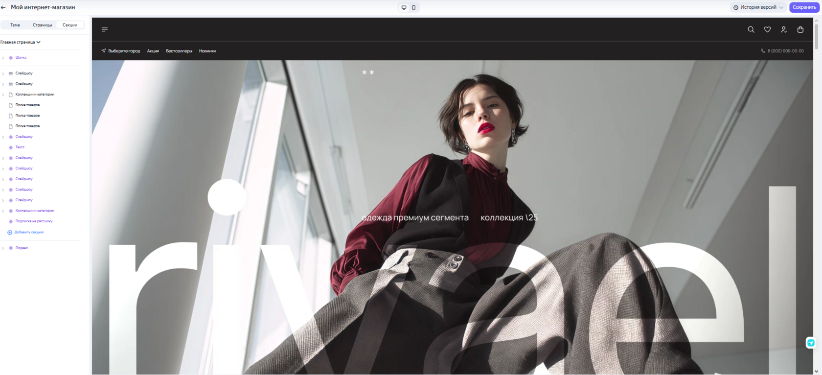 Здесь вы выбираете шаблон и настраиваете внешний вид. Панель ограничена: нельзя менять структуру страниц, добавлять собственный код или расширять функционал.