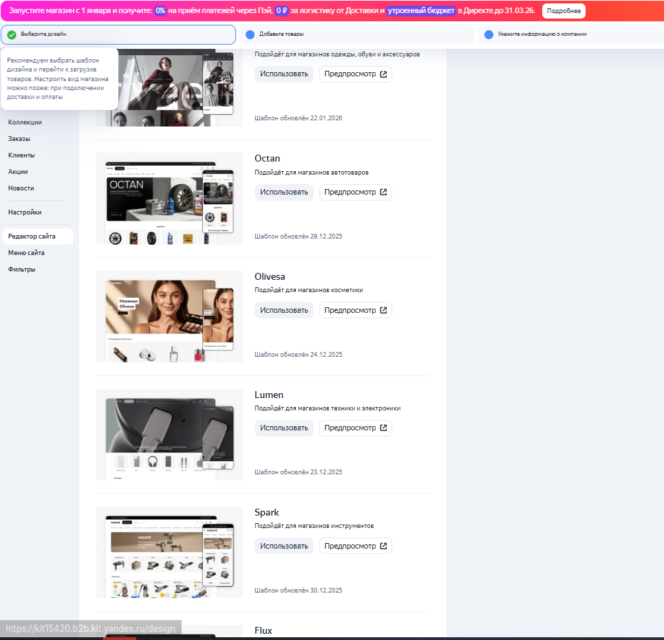 Платформа предлагает готовые дизайны для разных типов магазинов: