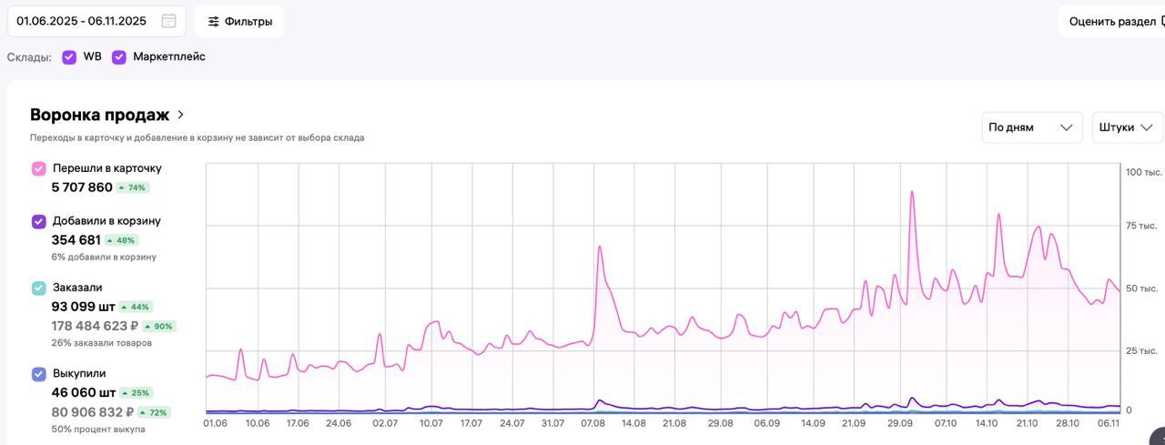 Если вы много раз улучшали визуал, карточки, пробовали инфлюенс-маркетинг, а товар всё равно не продаётся, — дело в продукте. Важно уметь вовремя сказать «спасибо» SKU и закрыть его. Скоро бесплатно поделюсь своим опытом подбора продукта на примере фэшн-ниши в своем курсе, следите за нашим сайтом.