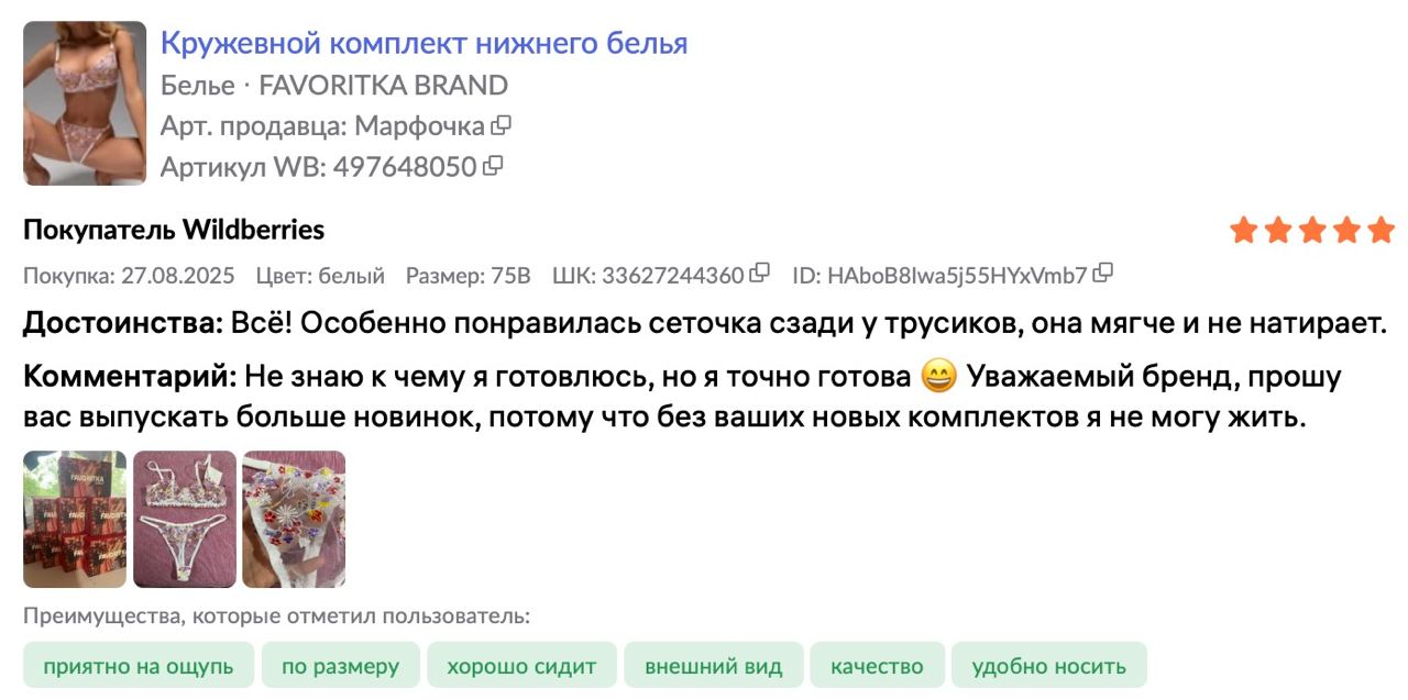 Сейчас FAVORITKA — уже не просто магазин на маркетплейсе, а задел под полноценный бренд, который будет жить и развиваться отдельно от алгоритмов WB. У нас даже появились подражатели, которые копируют ассортимент!