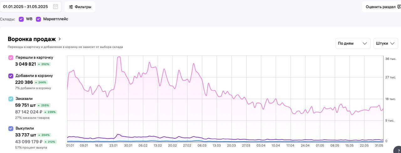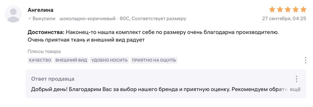 А ещё мы стали быстрее реагировать на обратную связь от покупателей. Так, например, мы улучшили размерную сетку по запросу из отзывов и это положительно отразилось на конверсии.