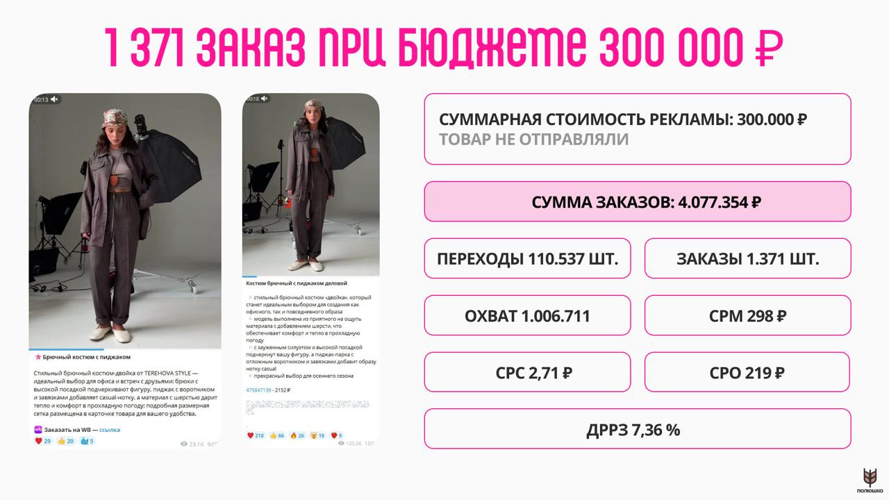 Кейс показывает, что трендовую одежду успешно продает не сложный продакшн, а правильная визуальная подача и точное попадание в контекст площадок. Сильные фото из карточки, разные цвета в постах и размещения в модных каналах и у стилистов дали высокую кликабельность с стабильной конверсией в заказы даже без авторских обзоров.